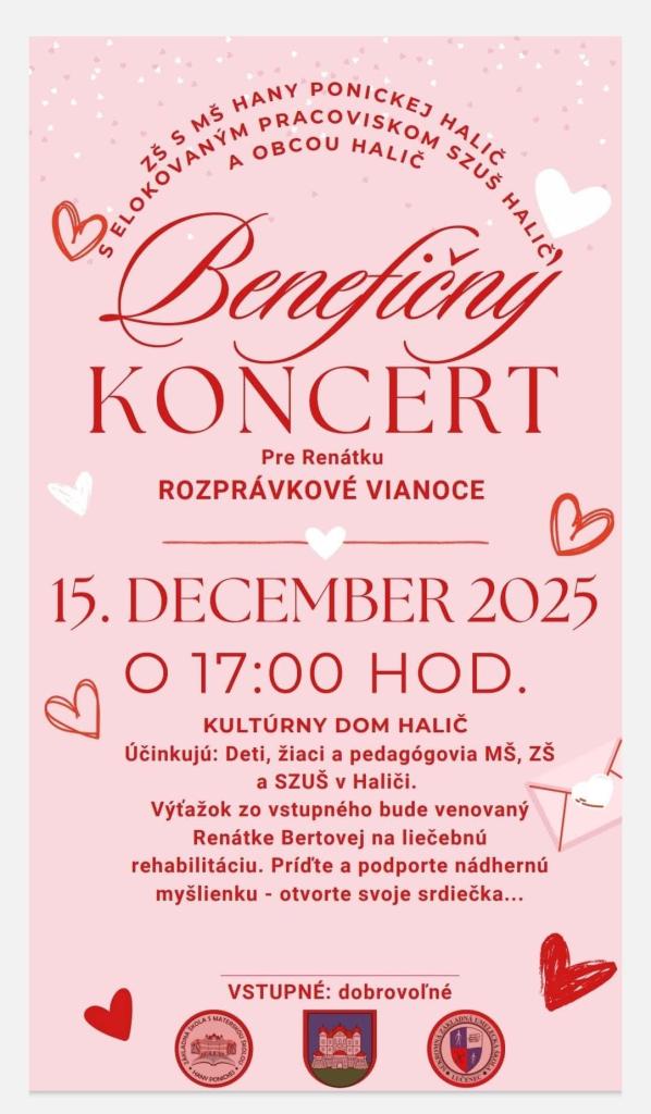 Príďte na benefičný koncert Rozprávkové Vianoce, ktorý sa uskutoční 15. decembra 2025 o 17:00 v Kultúrnom dome Halič. Na javisku sa predstavia deti, žiaci a pedagógovia z MŠ, ZŠ a SZUŠ v Haliči. Výťažok zo vstupného bude venovaný Renátke Bertovej na liečebnú rehabilitáciu, preto vás srdečne vyzývame, aby ste otvorili svoje srdiečka a podporili túto krásnu myšlienku.